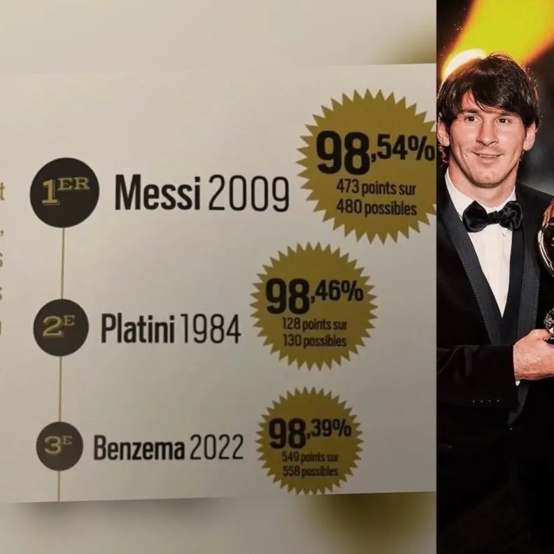 梅西在2009年的金球奖支持率还是历史第一,高达98.54%,在480分中有473分。第二是1984年的普拉蒂尼,130分中有128分,占比98.46%。第三是2022年的本泽马,558分中有549分,占比98.39%。本泽马确实猛,但还是那句话,如果当年进行的世界杯在金球奖评选周期内,那梅西会力压本泽马获奖。